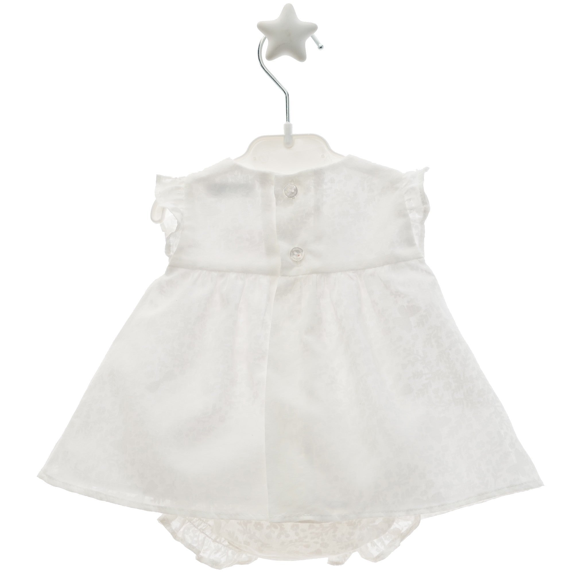 Description: This baby girl bloomer set is made in a soft cotton. The mini dress has fastens in the back with buttons. It also has decorative line in pink or turquoise. It comes with the matching bloomer.