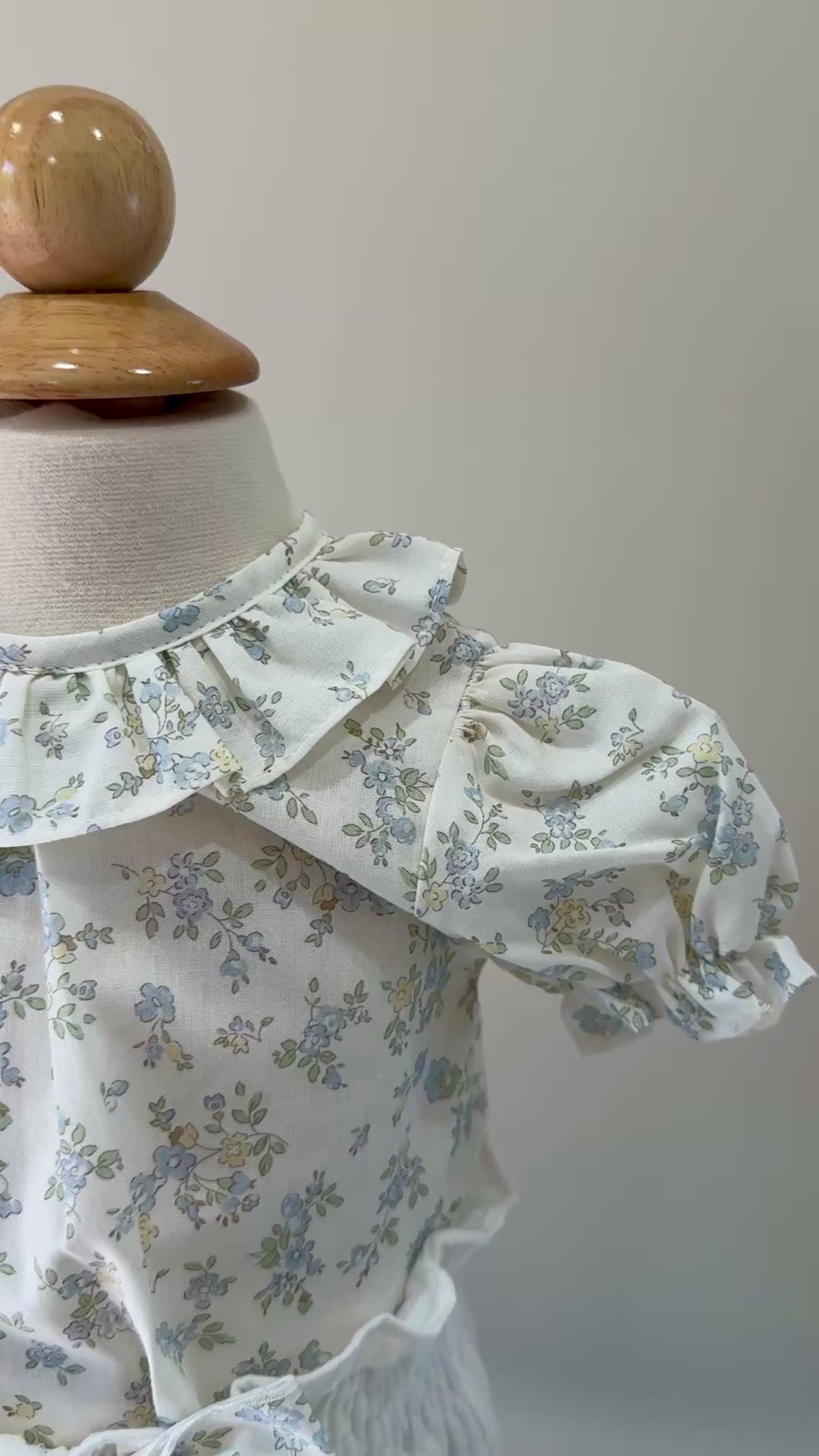 Description: Soft and lightweight cotton muslin bloomer set with the bow. The short sleeve shirt has a frilly collar and elasticated sleeve cuffs.