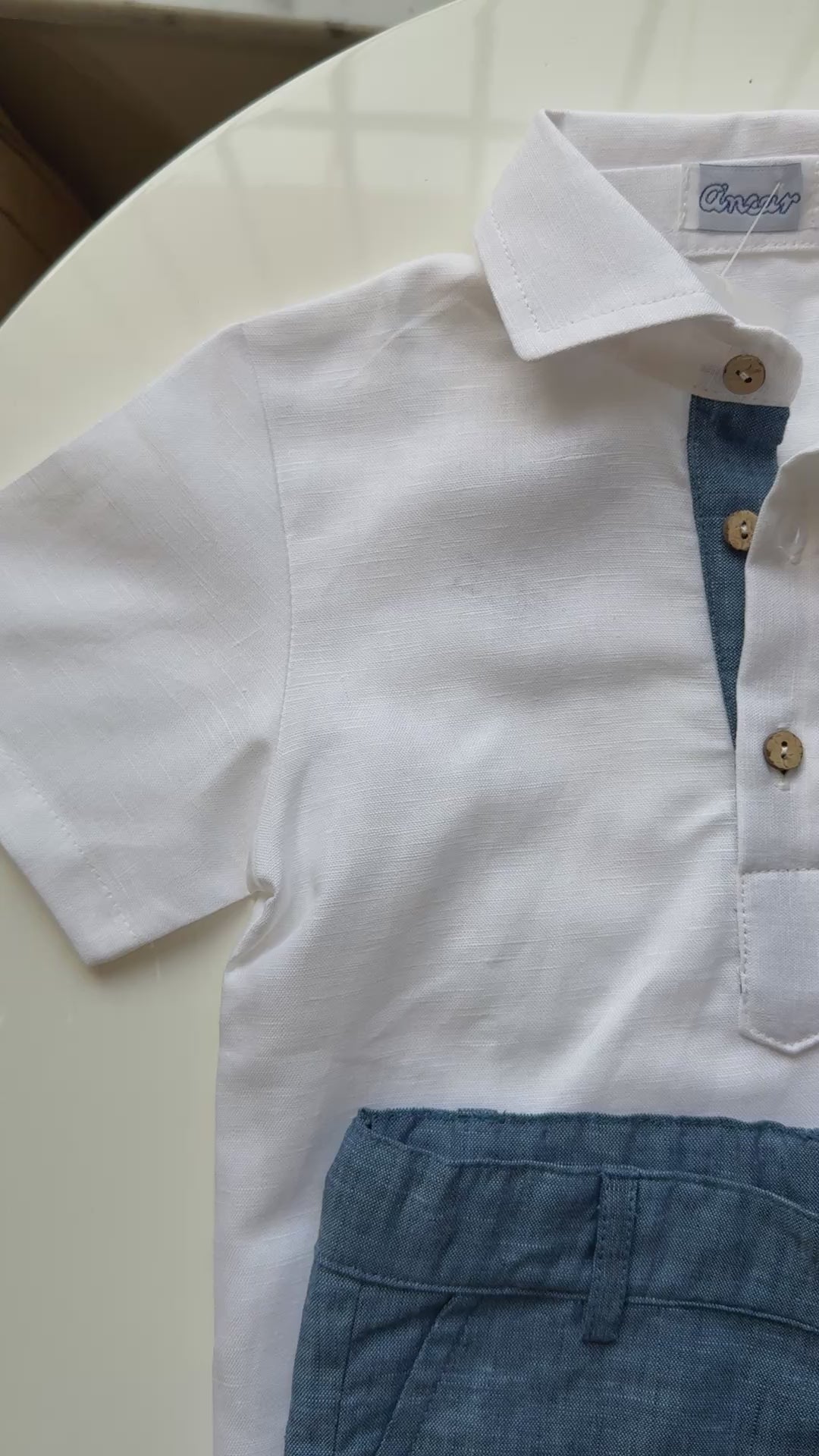 Description: This boy set features a white, short sleeved shirt with blue detailing and the matching blue shorts. The shorts have an elasticated waistband and it's also adjustable! Please note the shorts get longer as the age goes up- older ages have the bermuda shorts.