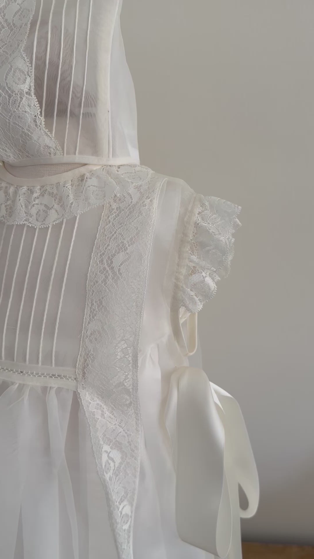 Description: Christening gown made in an exclusive plumetti crystal fabric. It has a lace collar and the same lace running through the bottom of the dress and ruffled in the sleeves. It has bows on each side and fastens with buttons in the back. It comes with the matching bonnet, up to size 24m. Size 36m & 4T does not have a bonnet.