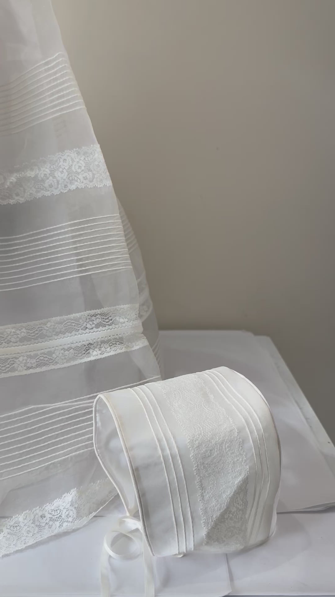 Description: Christening gown made in a plumetti crystal. The collar has a rounded lace and lace and pin tucks vertically on the bodice . The sleeve cuffs are also lined with lace. The skirt has horizontal lace stripes. It fastens in the back with buttons and comes with the matching bonnet. No cape.