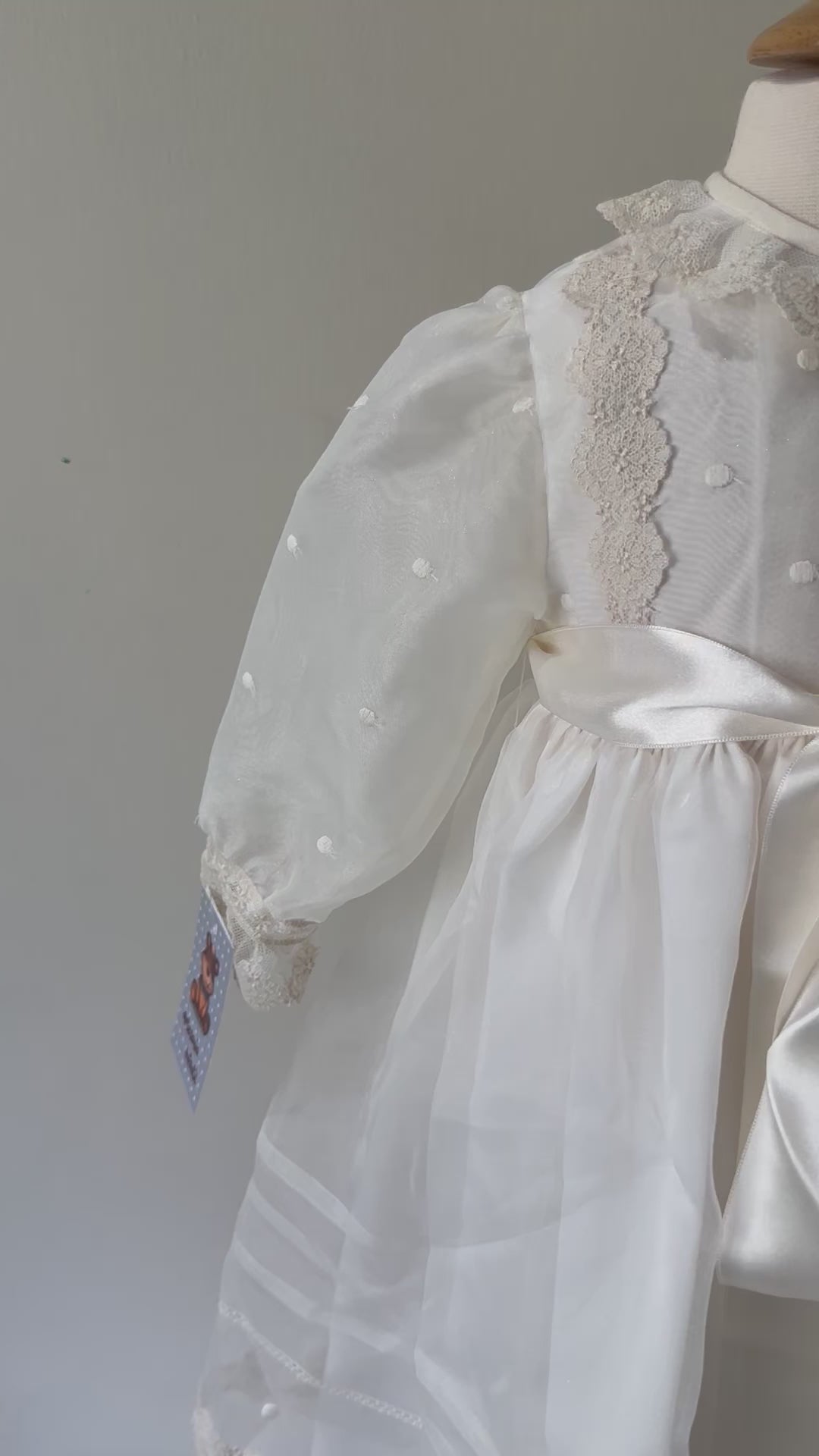 Description: Christening gown made in a plumetti crystal. The collar has a white lace and lace and pin tucks across the bodice. The bodice also has embroidered white dots. The sleeve cuffs are lined with lace and are elasticated. The skirt has horizontal lace stripes as well as embroidered white dots to match the lace. It fastens in the back with buttons and comes with the matching bonnet. No cape.