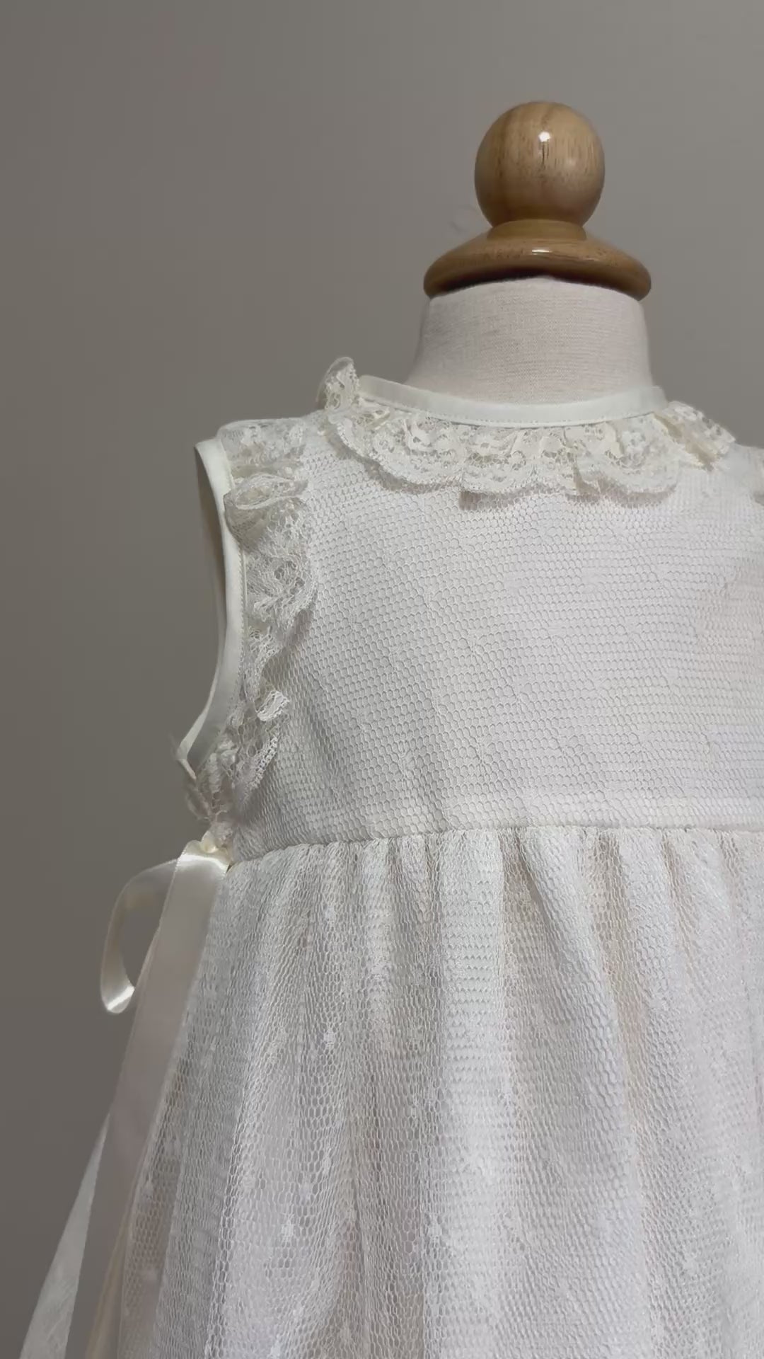 Description: This christening gown is perfect for that special day. Crafted in Spain, this sleeveless dress has a lace details on the collar, sleeves and skit. It fastens with buttons in the back. It comes with the matching bonnet.