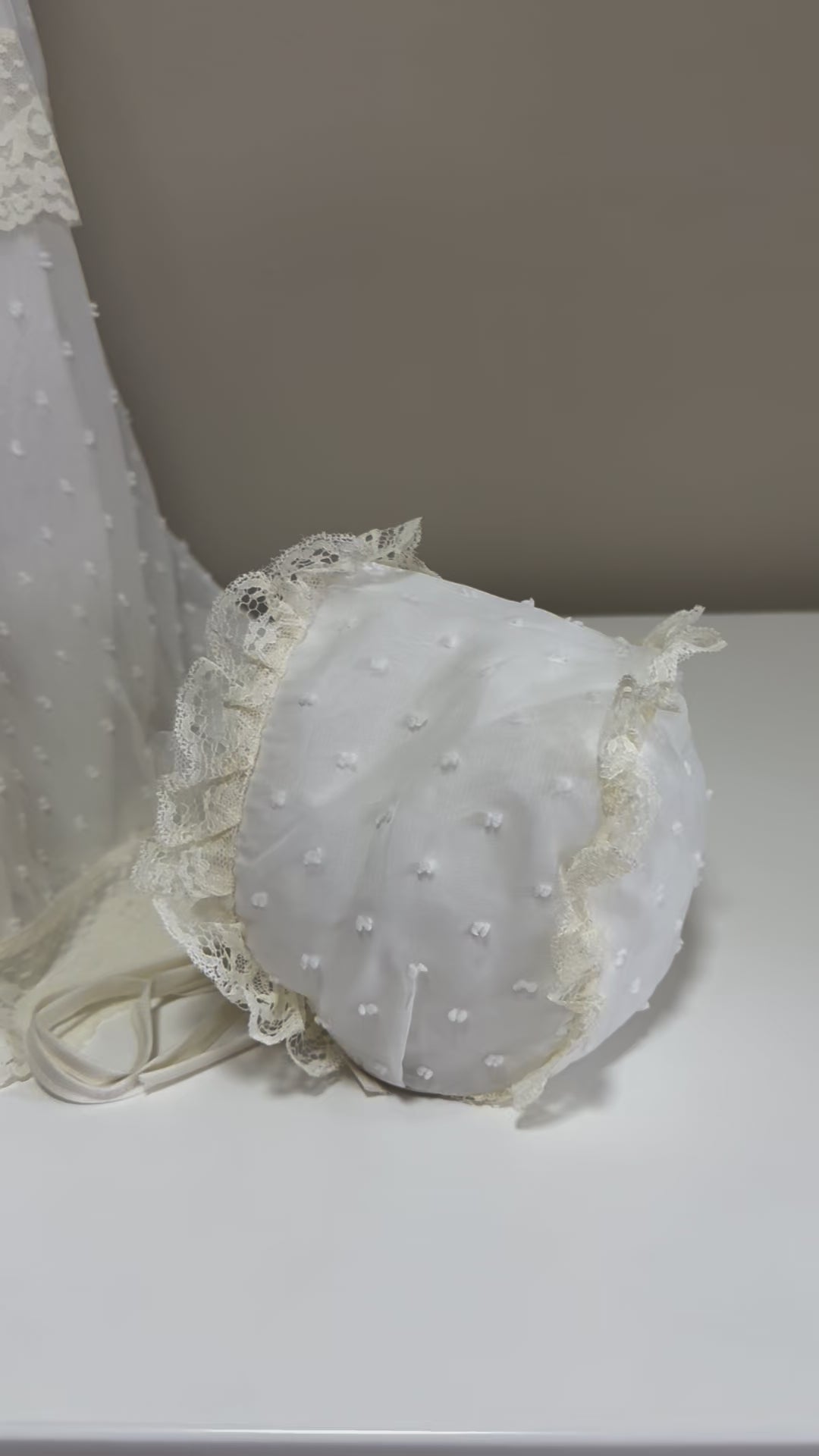 Description: This christening gown is perfect for that special day. Crafted in Spain, this sleeveless dress has a lace details on the collar, sleeves and skit. It fastens with buttons in the back. It comes with the matching bonnet.