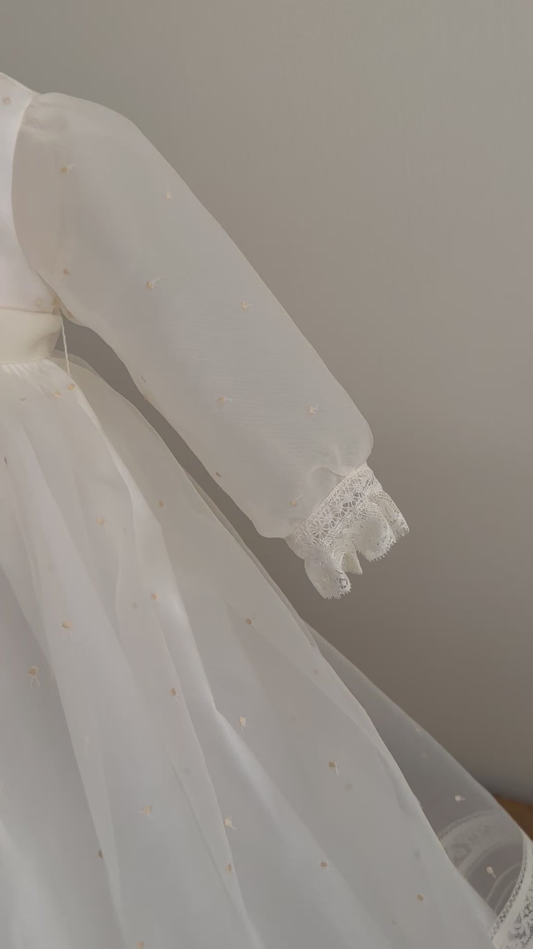 Description: Christening gown made in an exclusive plumetti crystal fabric. It has a lace collar and a lace line on the bodice. The sleeves are made out of the plumetti crystal with embroidered dots but aren't lined so they are a little see through. The sleeve cuffs are lined with lace. It has a satin sash that can be tied in the front or back (our suggestion if it's a boy). It fastens with buttons in the back and comes with the matching bonnet.