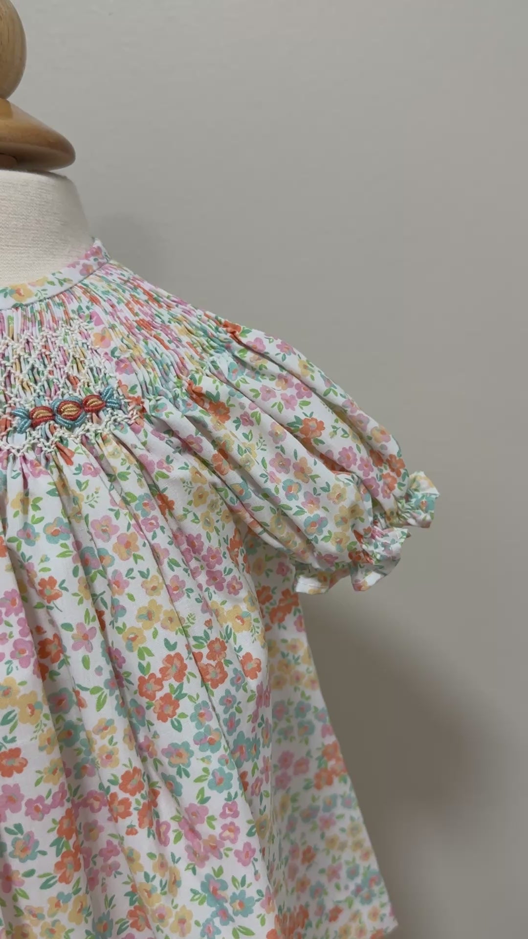 The hand-smocked collar, finished in a bodoque-style smocking technique, adds beautiful texture and artisanal charm to the design. The dress fastens with buttons at the back and is paired with a matching bloomer, making it both practical and elegant.