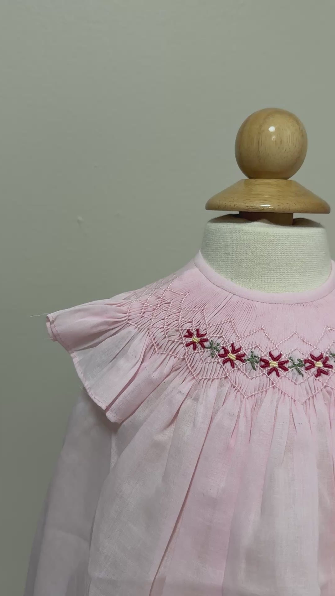 This DBB Ideas smocked bloomer set (Reference 0004) is a timeless and delicate two-piece design crafted in an all-pink cotton fabric for a soft, classic look. The set features a mini dress with a beautifully hand-smocked collar adorned with dark pink floral embroidery, adding depth and contrast to the monochromatic palette.