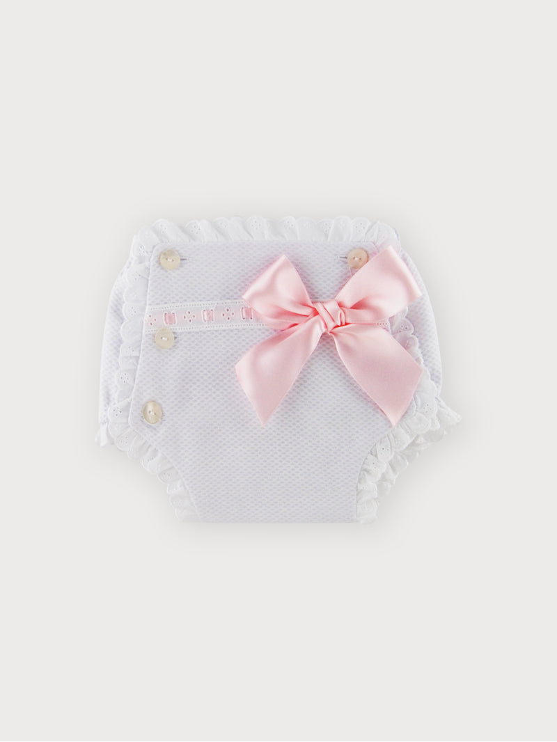 Description: This diaper cover is made in a piquet cotton. It has an elasticated waistband and leg cuffs. It has a lace running around the front as well as a satin bow.