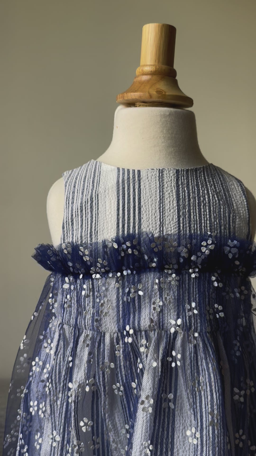 Description: This sleeveless dress is made in a striped cotton fabric. It fastens with a zipper on the back and has a tulle cover with silver dots that look like flowers.
