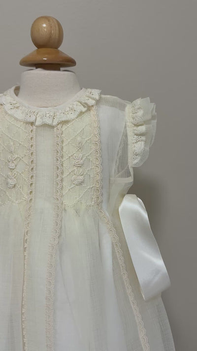 Description: This girl dress is perfect for a special occasion. It has two satin, beige bows on each side and fastens in the back with the buttons. The collar is lined with a lace, it also has frill collar and sleeves. The lining is done in an ivory fabric.