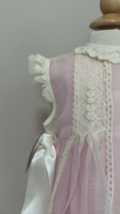 Description: This girl dress is perfect for a special occasion. It has two satin, beige bows on each side and fastens in the back with the buttons. The collar is lined with a lace, it also has frill collar and sleeves. The lining is done in an ivory fabric.