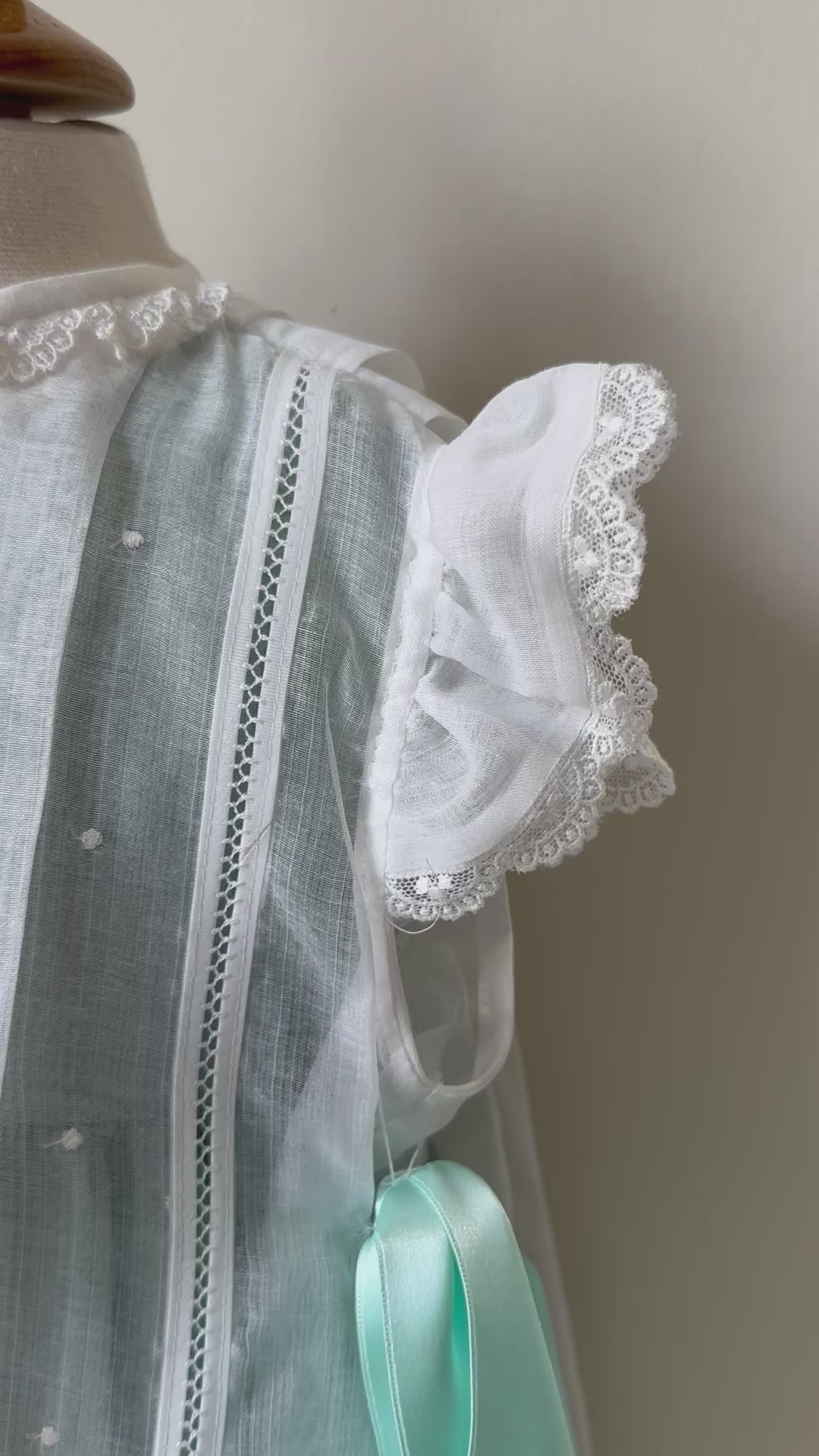 Description: This girl dress is perfect for a special occasion. It has two satin, green bows on each side and fastens in the back with the buttons. The collar is lined with a lace. The lining is done in a white fabric.
