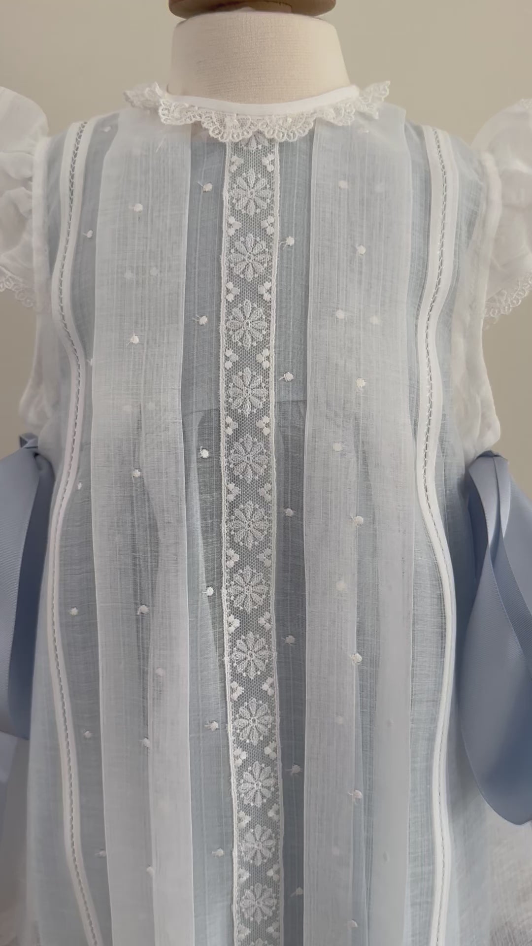 Description: This girl dress is perfect for a special occasion. It has two satin, blue bows on each side and fastens in the back with the buttons. The collar is lined with a lace. The lining is done in a white fabric.