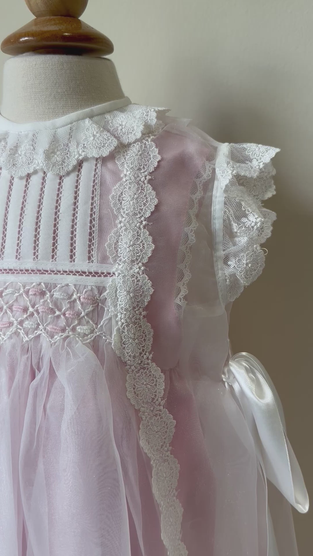 Description: Toddler girl dress made in an exclusive English batiste. It has a lace collar and white colored lace running vertically in the bodice. It has two satin, white bows on each side and is fully lined.
