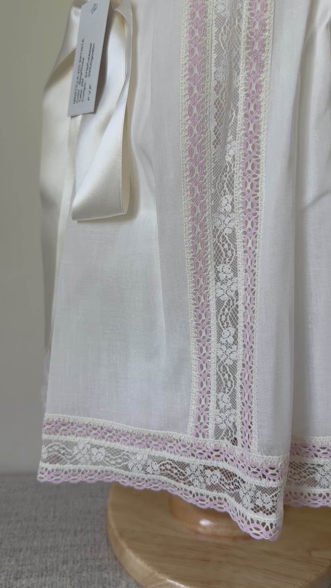 Description: Toddler girl dress made in a pluetti . It has a lace collar and white colored lace running vertically in the bodice. It has two satin, white bows on each side and is fully lined.