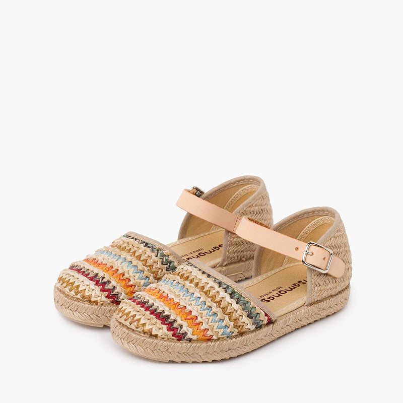 Description: These espadrilles are made out of rafia material with a rubber sole. It fastens with buckles to the side.
