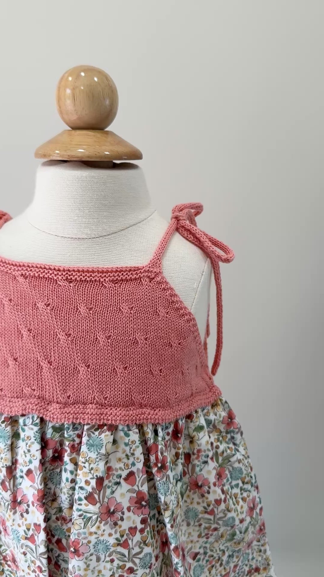 Description: Coral dress by Paloma de la O featuring a charming knitted bodice paired with a delicate floral skirt for baby girls. Crafted from soft cotton, this dress offers comfort and style for warm days with adjustable straps.
