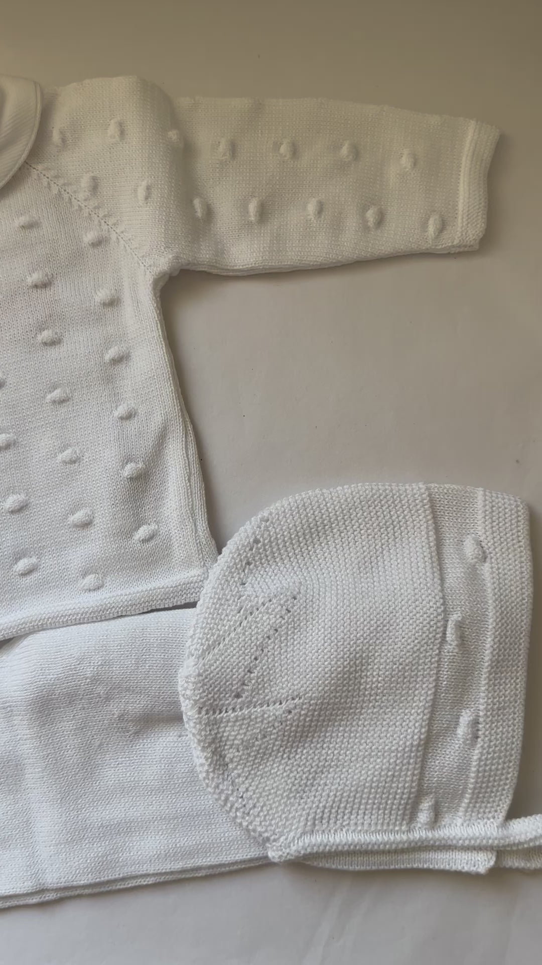 Description: This three piece knit set is made up of the bonnet, sweater and footies. It is perfect for a going home outfit.