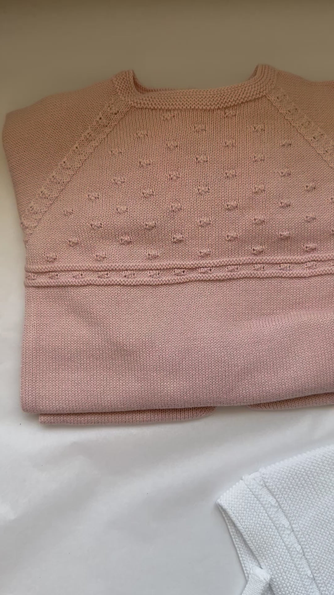 Description: This three piece knit set is made up of the bonnet, sweater and footies. It is perfect for a going home outfit.