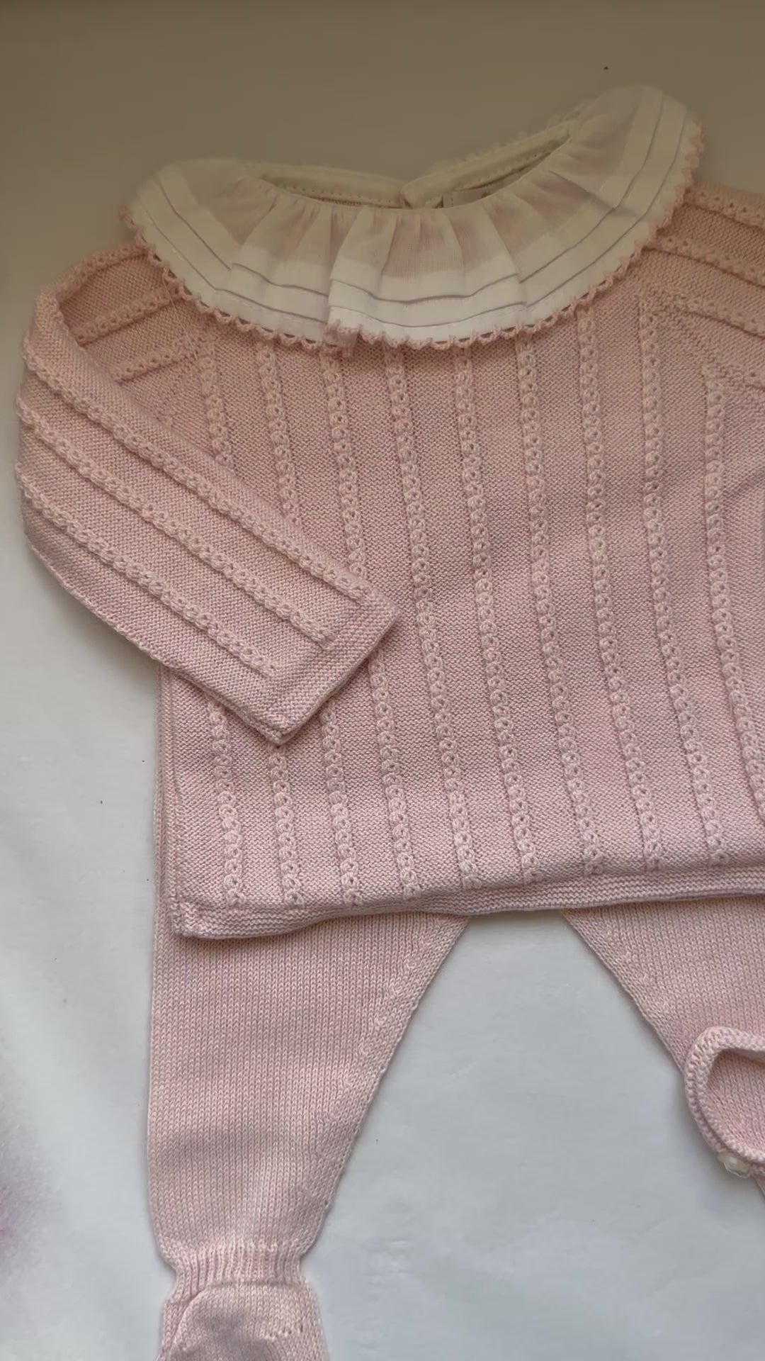 Description: This three piece knit set is made up of the bonnet, sweater and footies. It is perfect for a going home outfit.