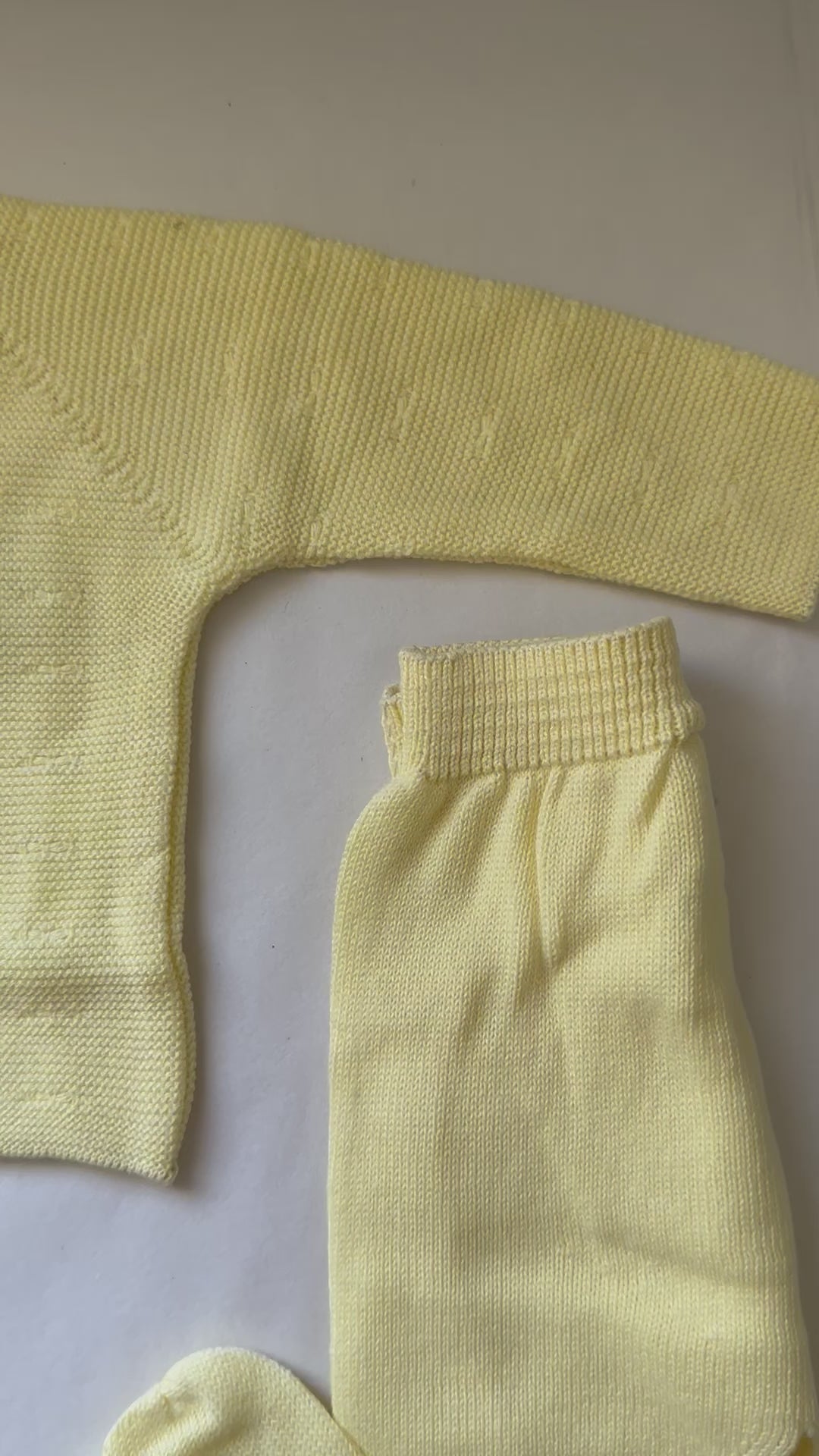 Description: This three piece knit set is made up of the bonnet, sweater and footies. It is perfect for a going home outfit.