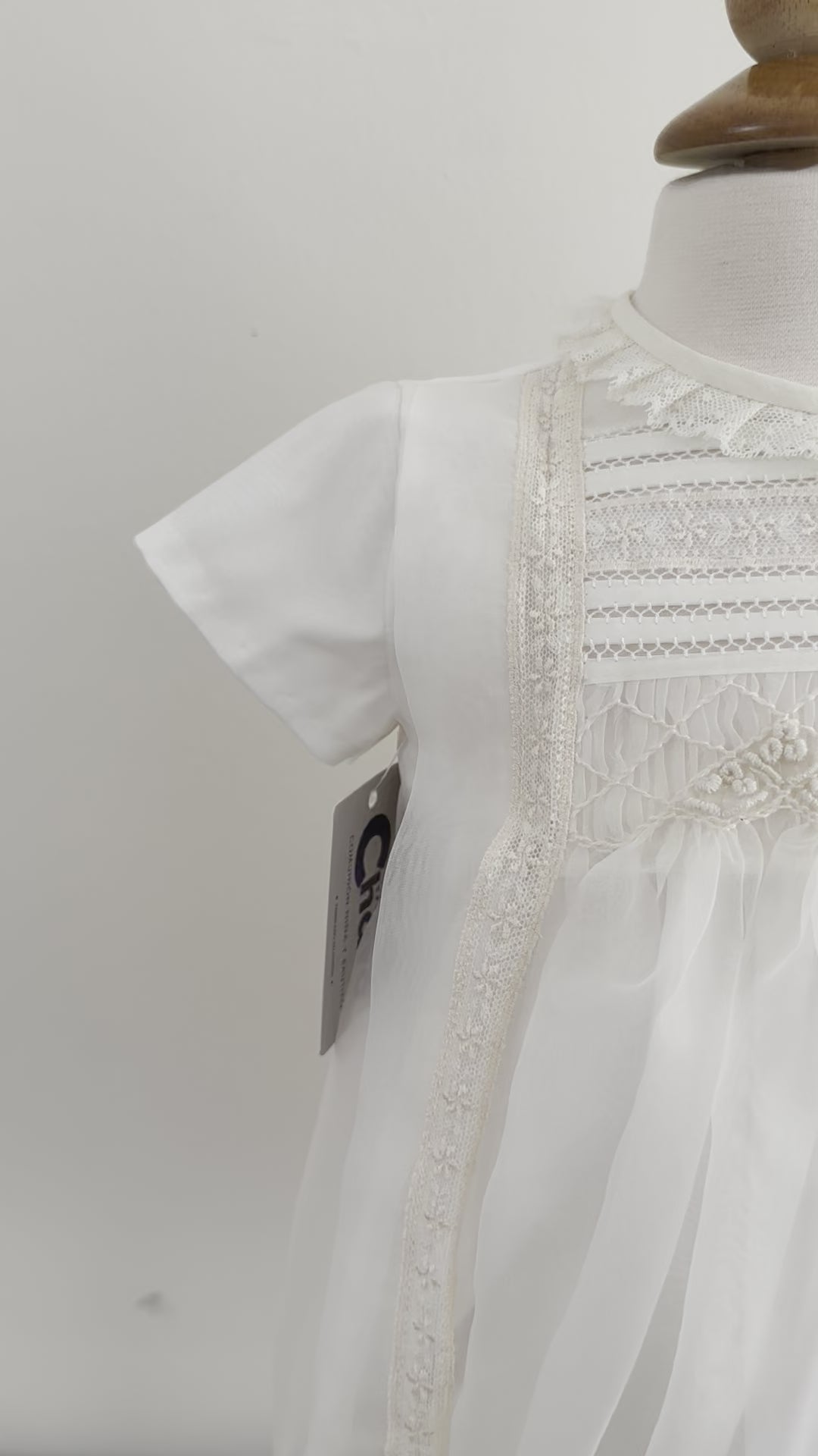 Description: Unisex baby romper that can be used for christening or special occasions. It is made out of a crystal plumetti fabric. It has frill, lace collar and a smocked area in beige on the waist. It fastens with buttons in the bottom and in the back.
