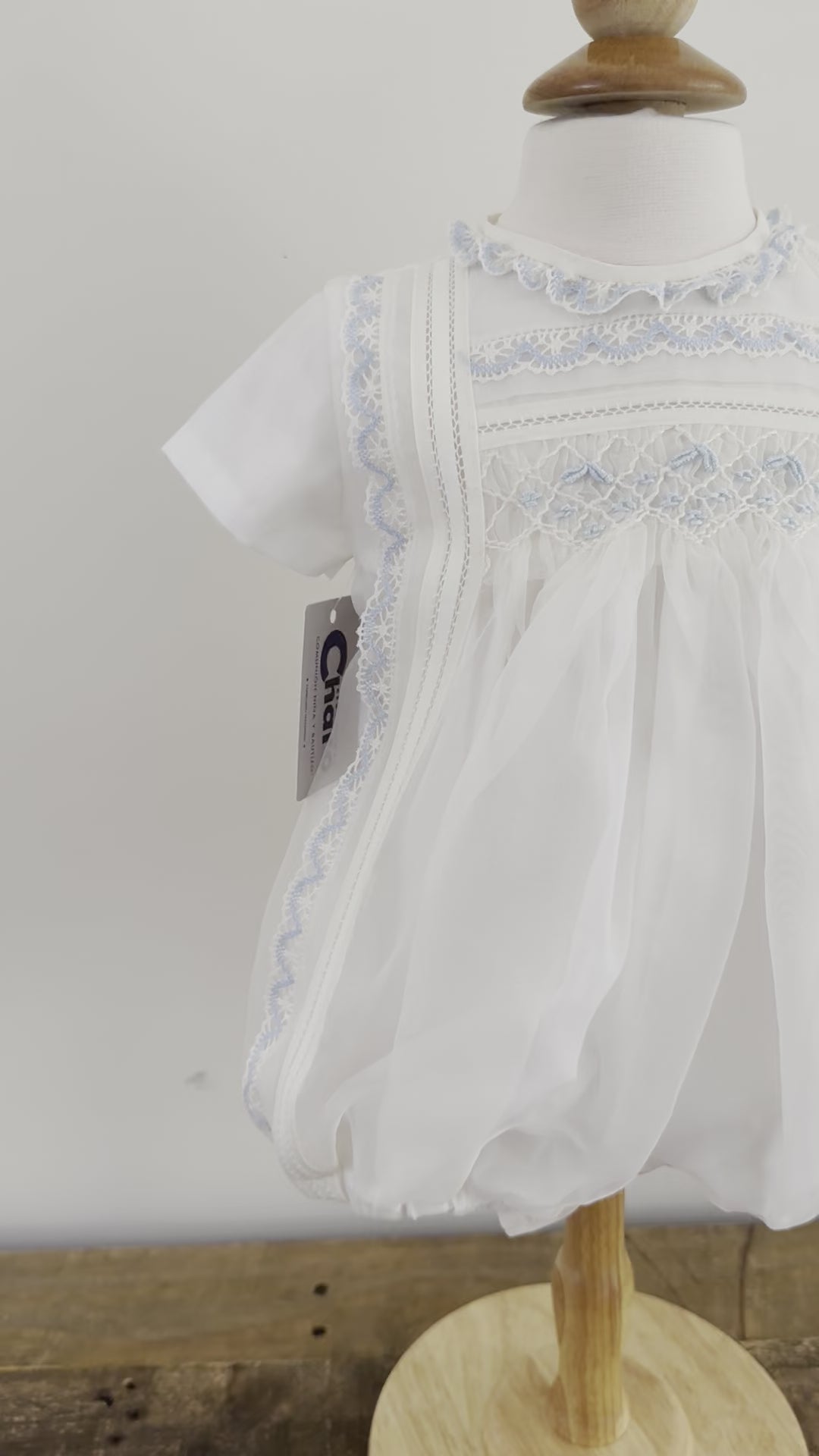 Description: Unisex baby romper that can be used for christening or special occasions. It is made out of a crystal plumetti fabric. It has frill, lace collar and lace details in blue all around the bodice. It fastens with buttons in the bottom and in the back.