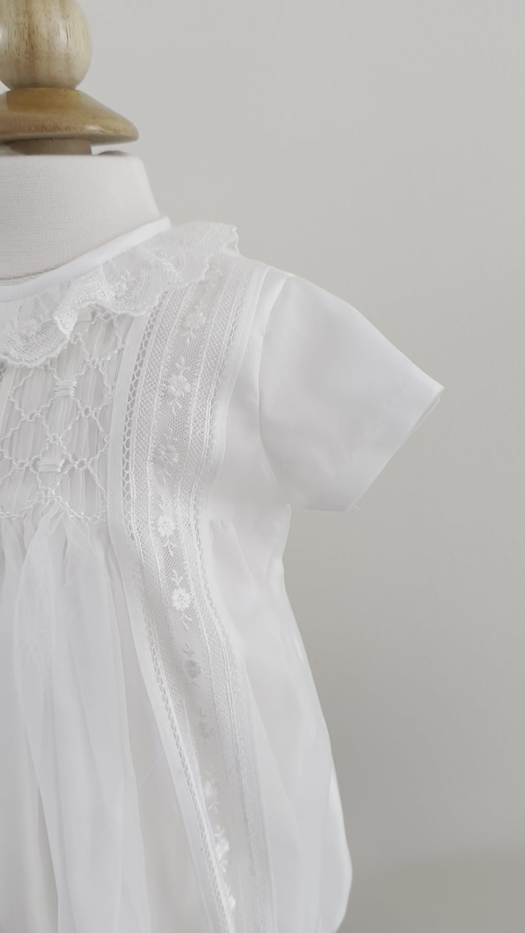 Description: Unisex baby romper that can be used for christening or special occasions. It is made out of a crystal plumetti fabric. It has frill, lace collar and lace details in blue all around the bodice. It fastens with buttons in the bottom and in the back.
