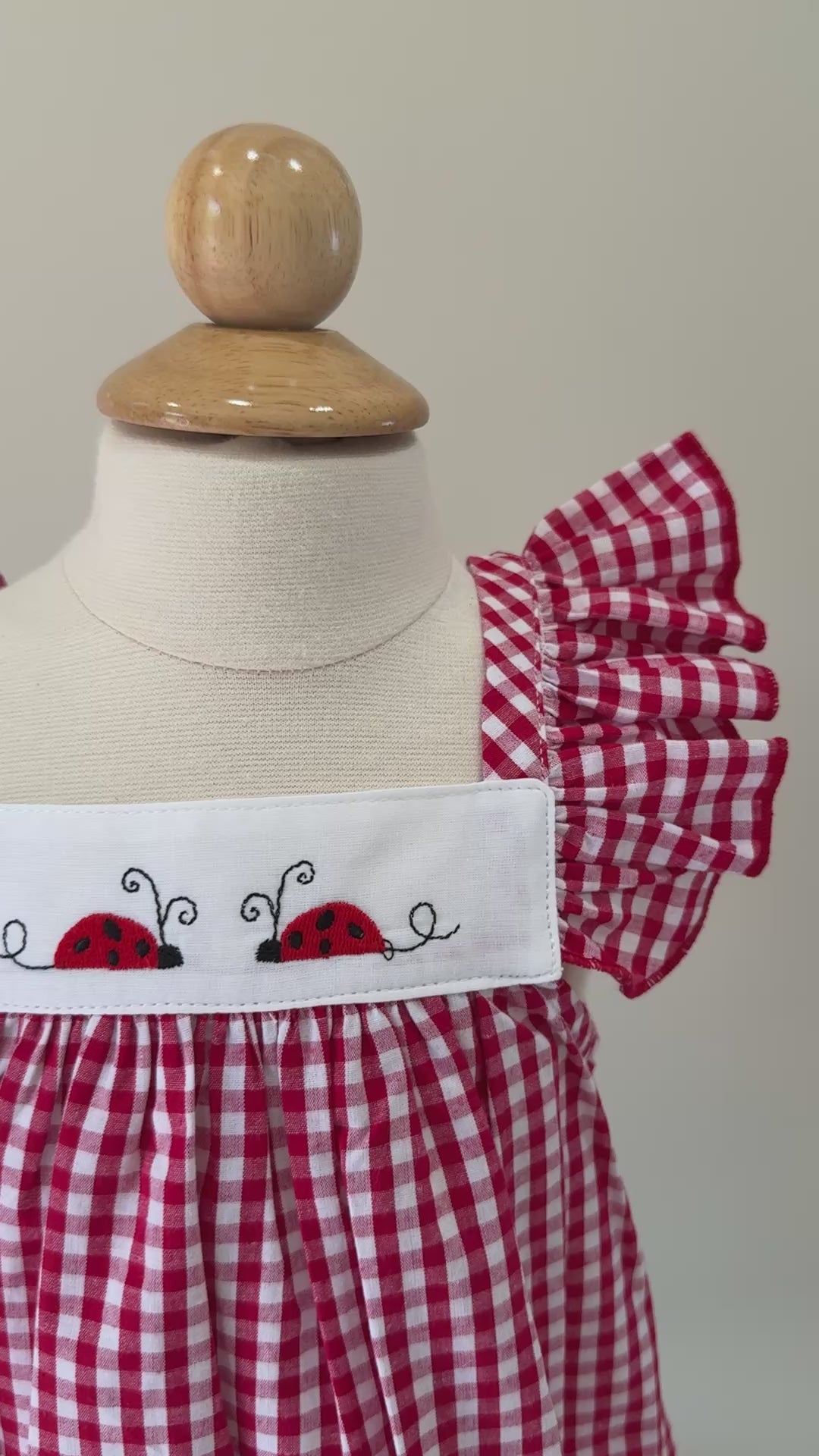 Description: Soft and lightweight cotton. It has frill sleeves and embroidered lady bugs in the front. It fastens with buttons in the back and in the bottom.