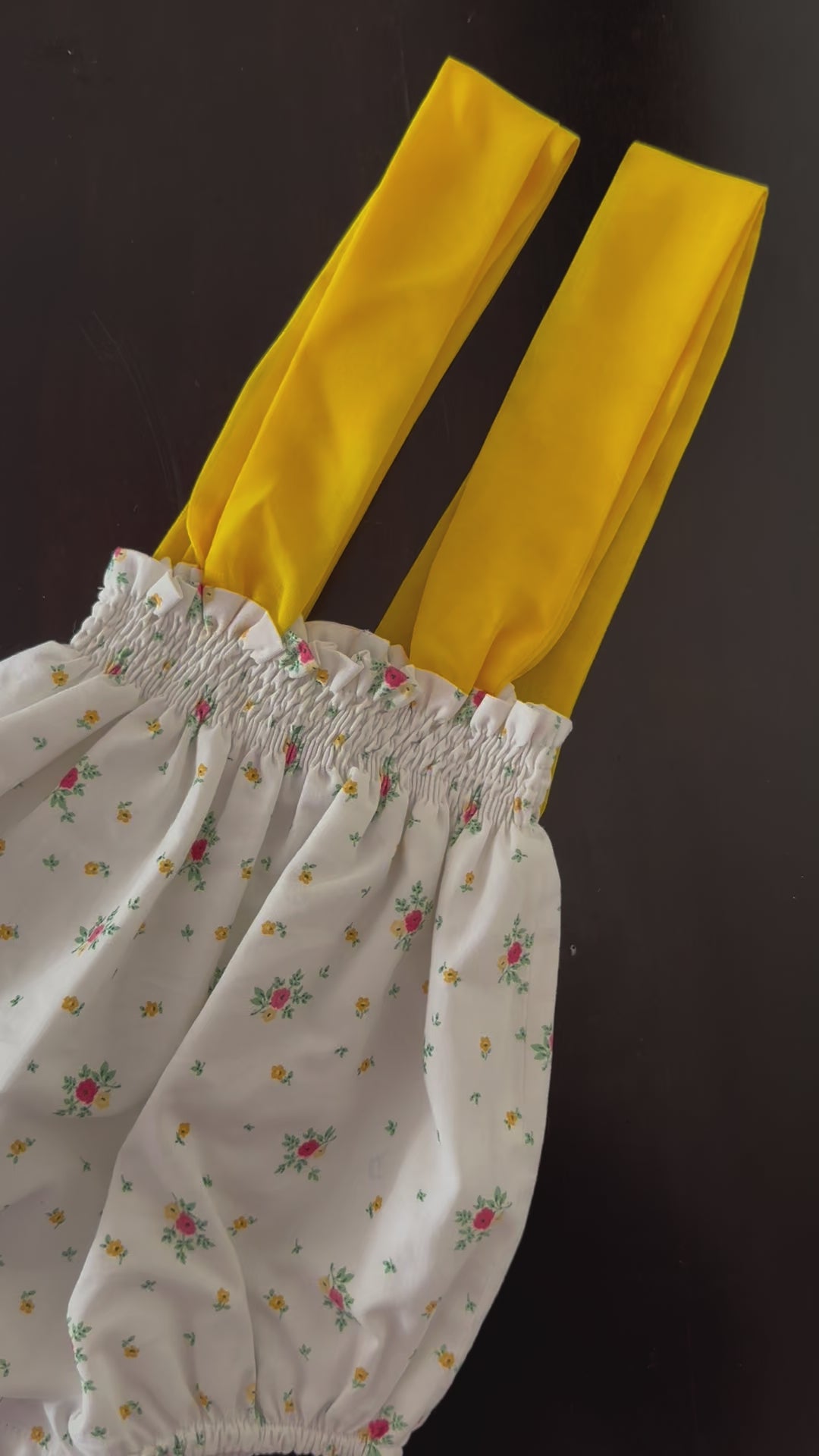 Description: This girl romper is made in a soft, lightweight cotton. The romper print is yellow and fuchsia flowers. It has a sired chest that is elasticated and elasticated leg cuffs. It fastens in the bottom with buttons and with yellow straps on the shoulders. Hand smocked in Spain.