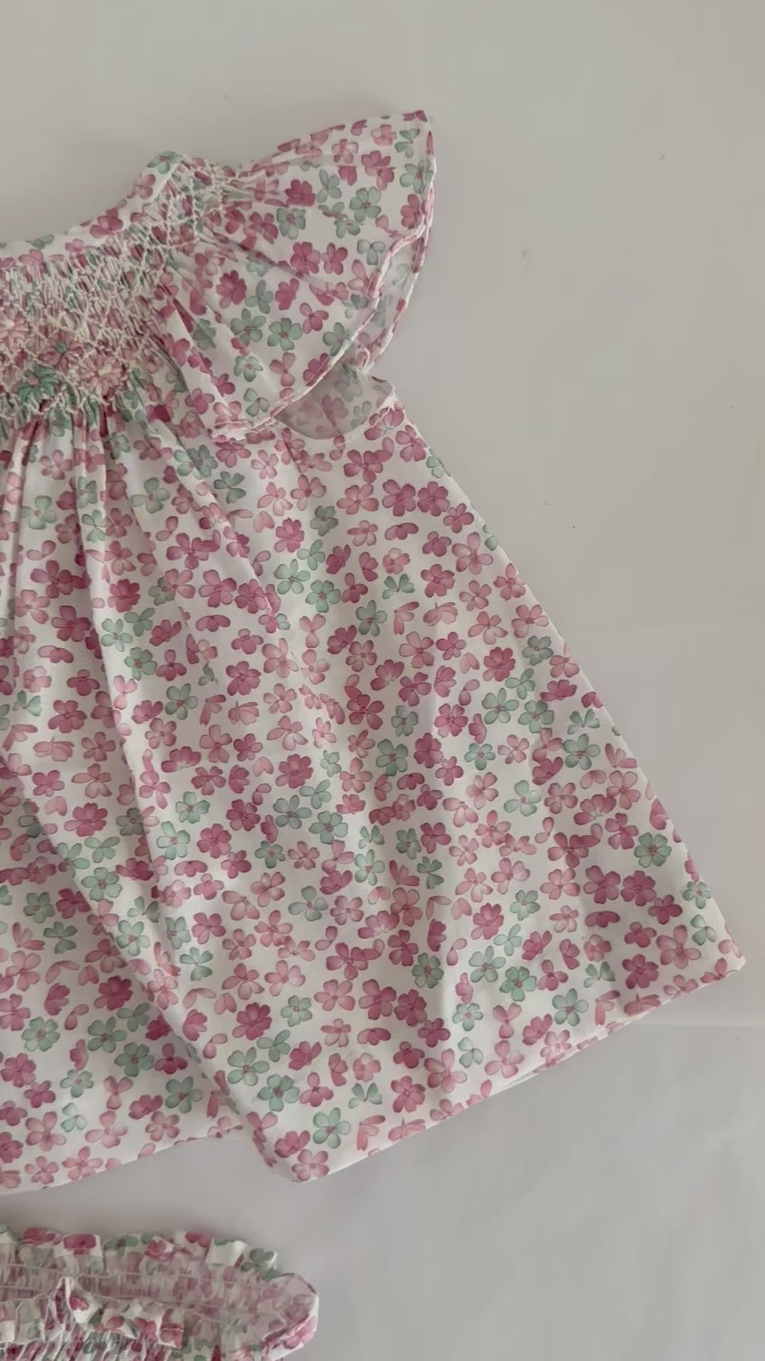 Description: This bloomer set is perfect for spring. The print has a white background with pink flowers. Hand smocked in Spain. The bloomer has an elasticated waistband and leg cuffs.