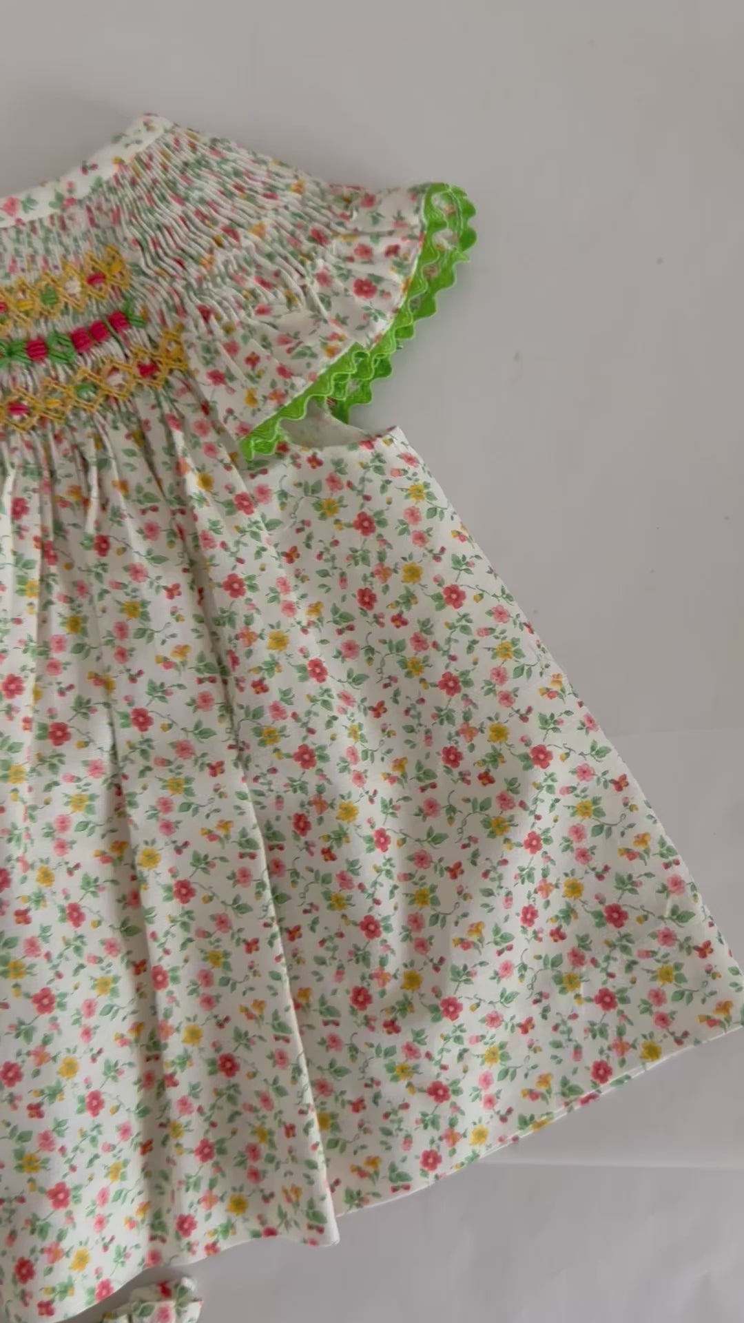 Description: This bloomer set is perfect for spring. The print has a white background with flowers. Hand smocked in Spain. The bloomer has an elasticated waistband and leg cuffs.