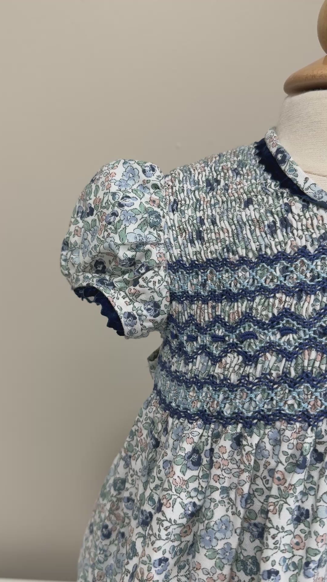 Description: This short sleeve dress has a blue velvet piping in the collar and smock in the chest area. It fastens with buttons in the back and is fully lined.