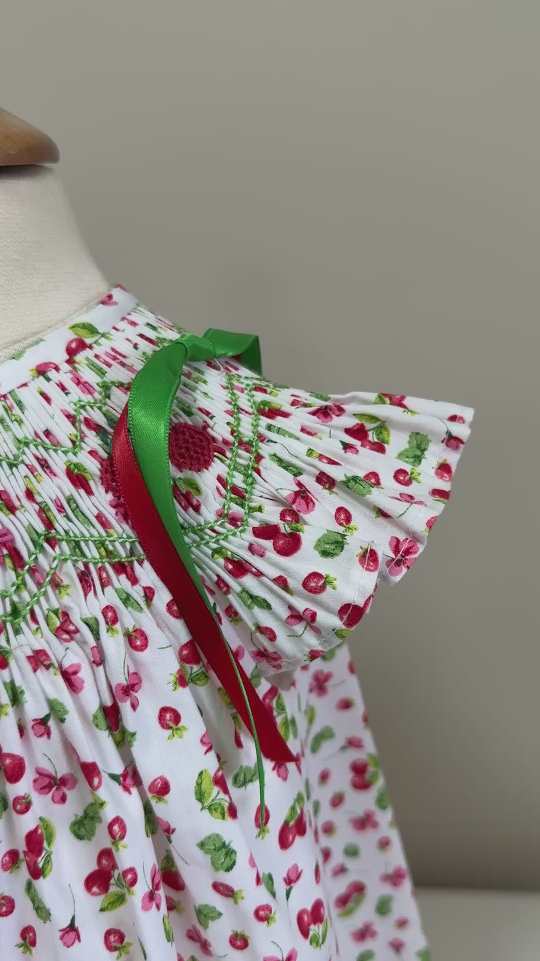 Description: This girl, smocked, bishop dress is made in a soft, lightweight cotton. The dress is made in a cherry print with strawberries, cherries and flowers smocked on the collar. It comes with green and red satin sashes on each shoulder side and has angel wing sleeves. It fastens with buttons in the back.