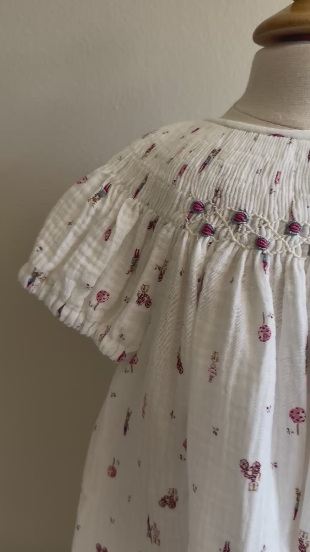 Description: This hand smocked dress is perfect for the special occasions coming up throughout the year. The bishop dress is done in an animal pattern. It fastens with buttons in the back.