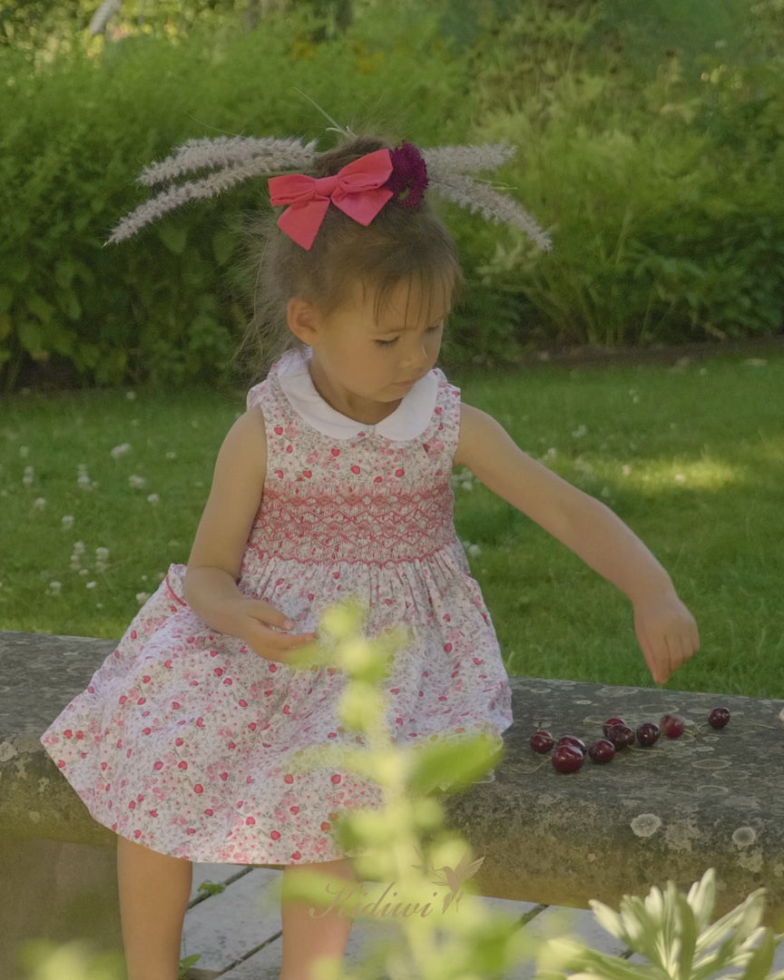 A charming smocked dress for girls featuring a delicate cherry red floral print, designed by French brand Kidiwi. Crafted in lightweight 100% cotton, the Ixia dress is breathable, soft, and perfect for warm summer days.