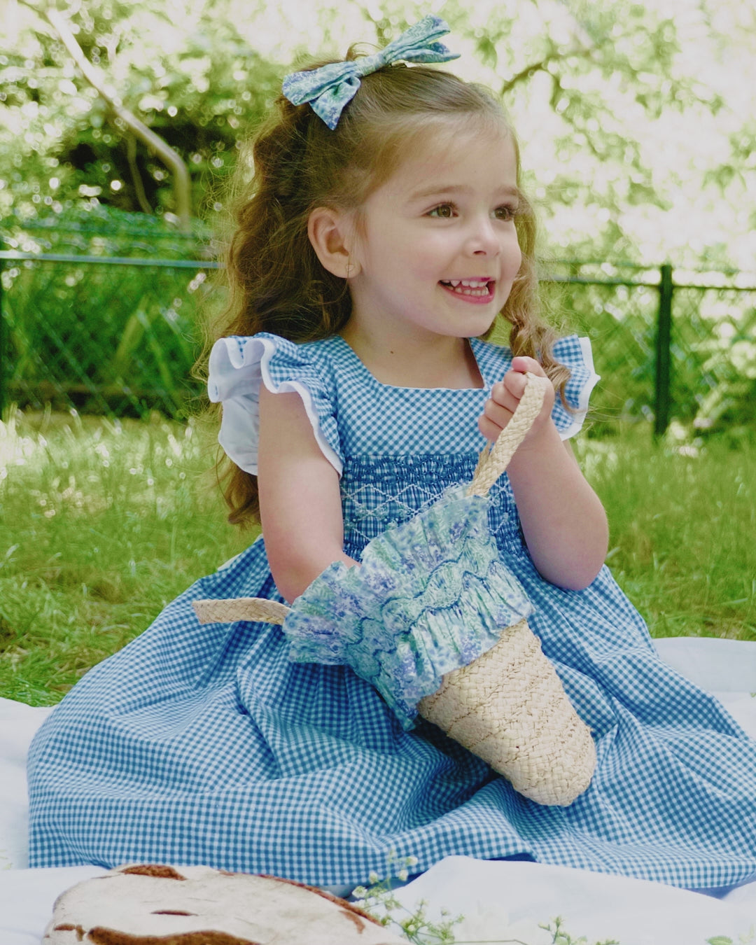 It's fully smocked at the waist by hand, a labor of love and care. It features a double ruffled collar. The back reveals even more charming details with ruffles that extend all the way to the back.
