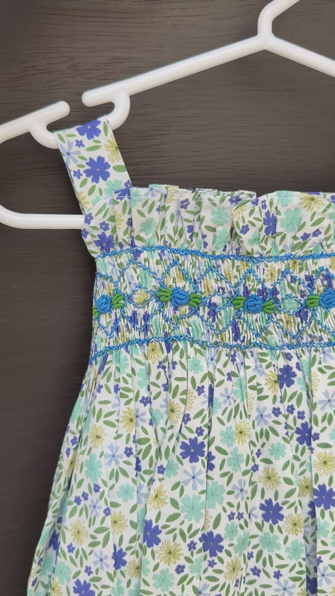 Description: This girl smock dressed Is made in a soft and lightweight cotton. The smock is done in a blue floral fabric and is fully lined. It fastens with buttons in the back.
