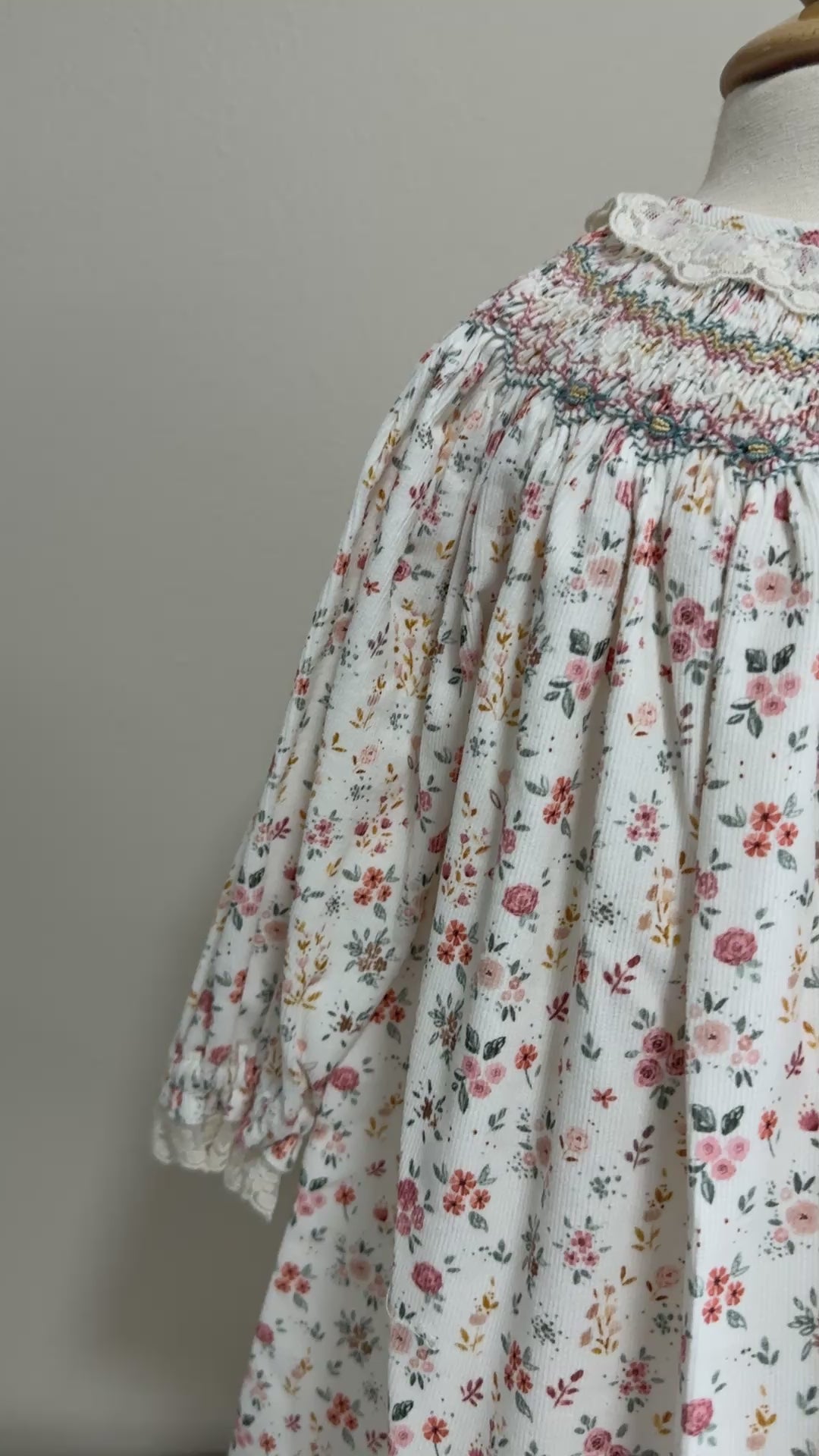 Description: This girl smocked bishop dress is made in a soft, lightweight cotton. The long sleeves are elasticated, it has a lace collar in a beige tone and smock around the collar. Fastens with buttons in the back.