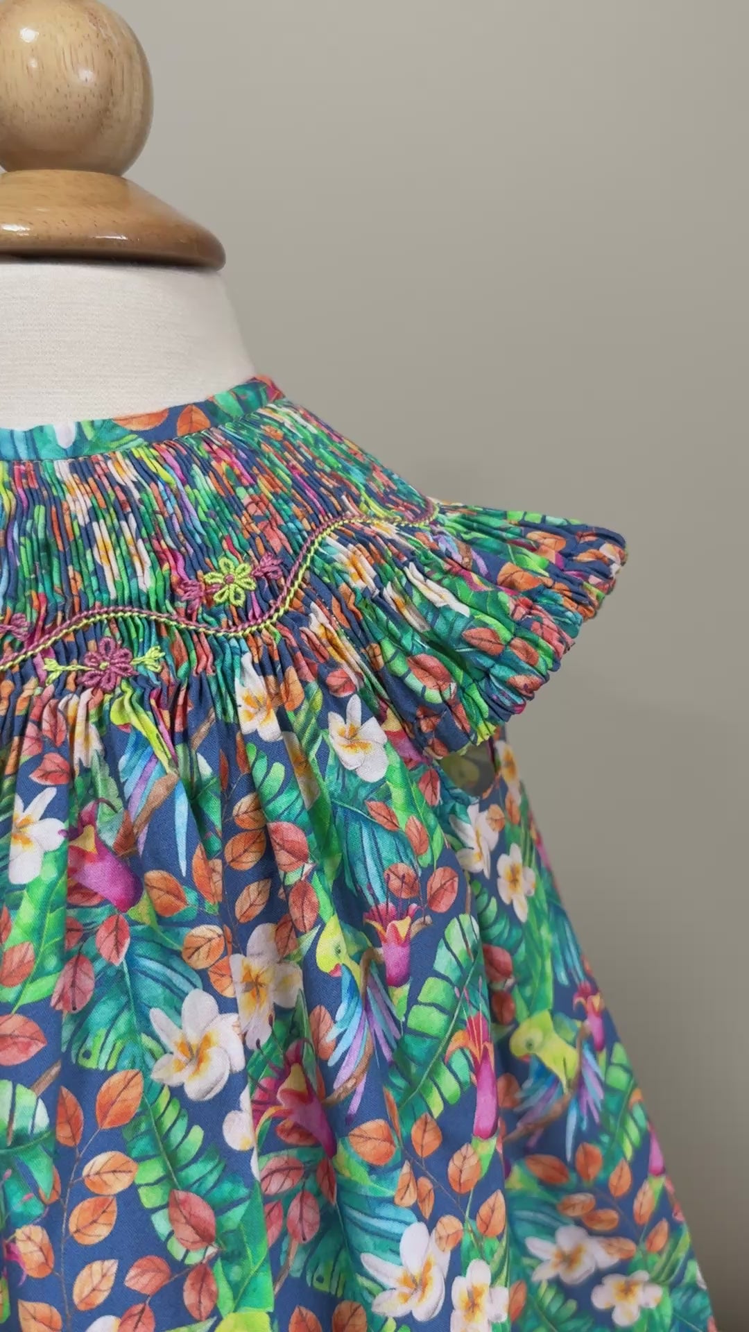 Description: This girl, smocked, bishop dress is made in a soft, lightweight cotton. The dress is made in a tropical, floral print. The sleeves are elasticated and fastens with buttons in the back.
