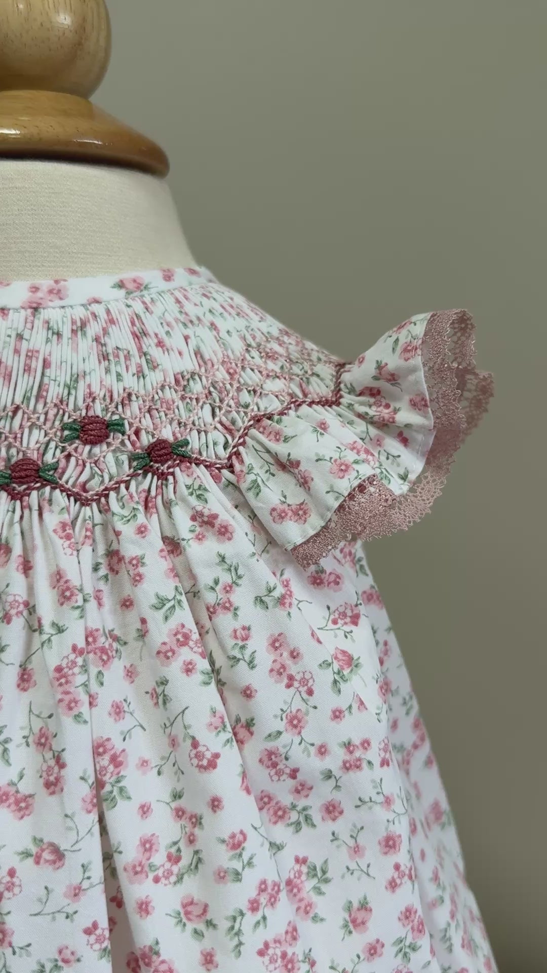 Description: This girl, smocked, bishop dress is made in a soft, lightweight cotton. The dress is made in a soft floral print. The angel wing sleeves have a dusty pink lace on it. The dress fastens with buttons in the back.