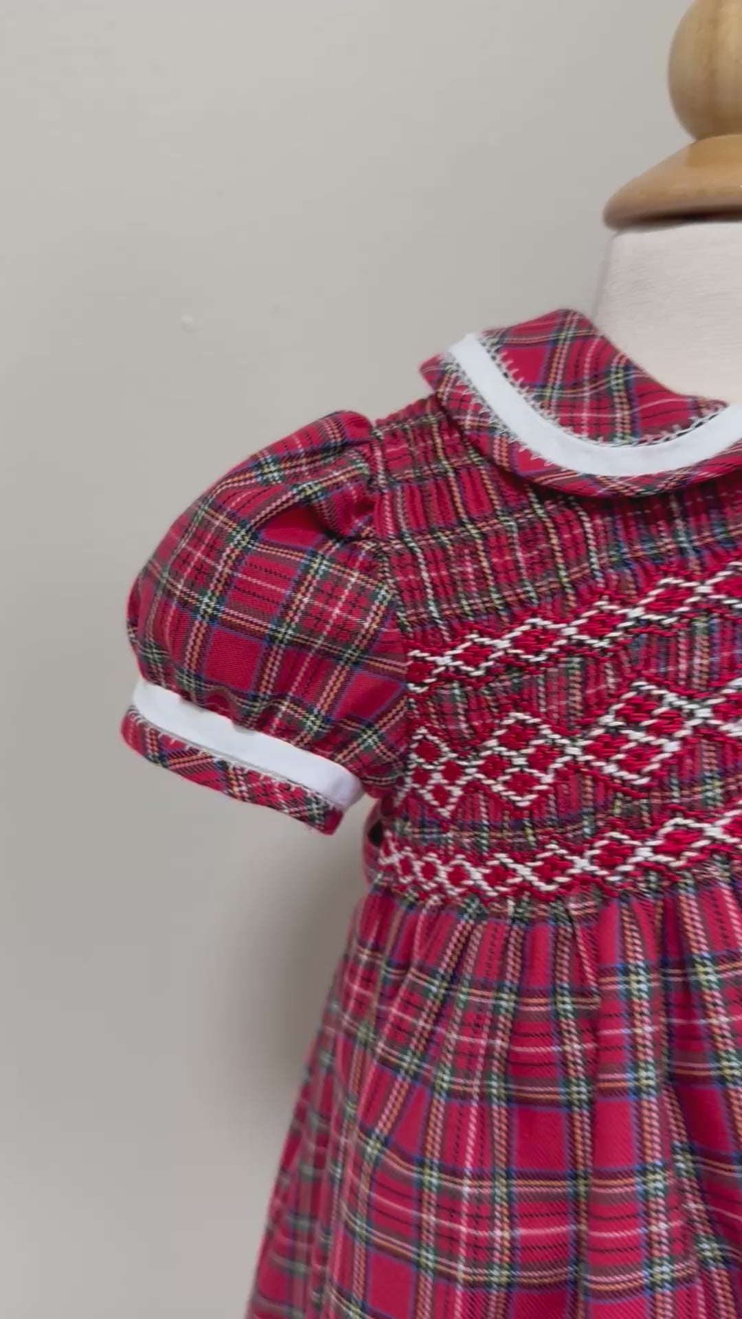 Description: This short sleeve, red dress has a rounded collar and smock in the chest area. It fastens with buttons in the back and is fully lined.