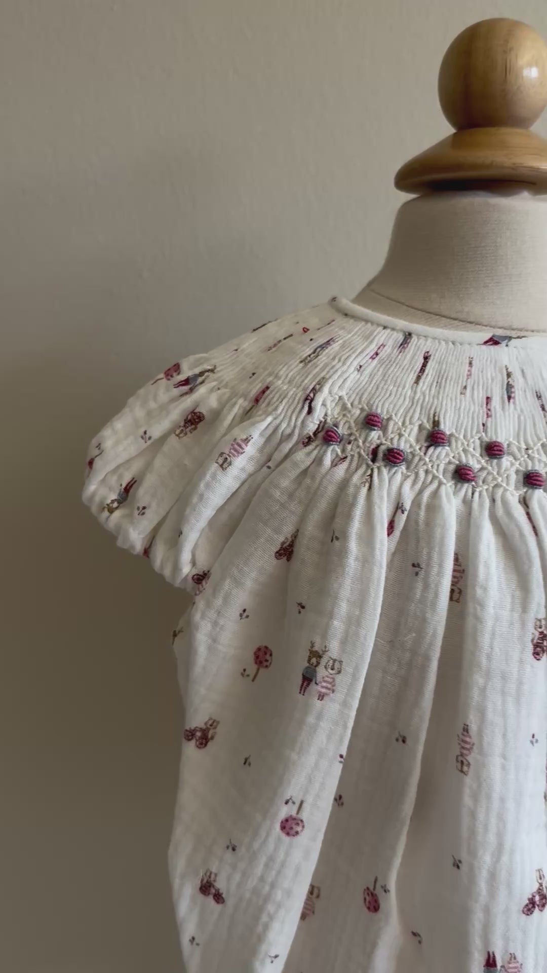 Description: This girl smocked romper is made in a soft, lightweight cotton. The romper print is little animals. It has a smocked collar made and elasticated sleeves. It fastens with buttons through the back and the bottom.