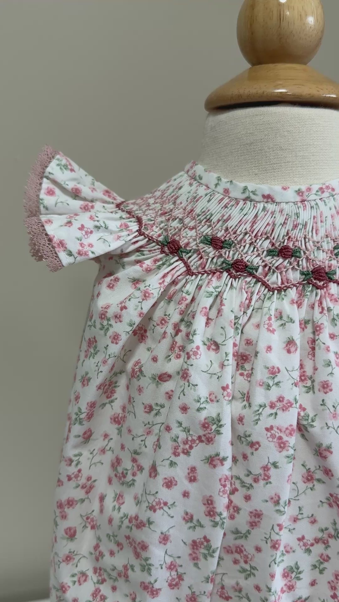 Description: This hand smocked romper is very similar to the girl dress version. It has a smocked collar and elasticated sleeves with lace lining. It fastens with buttons in the back and in the bottom.